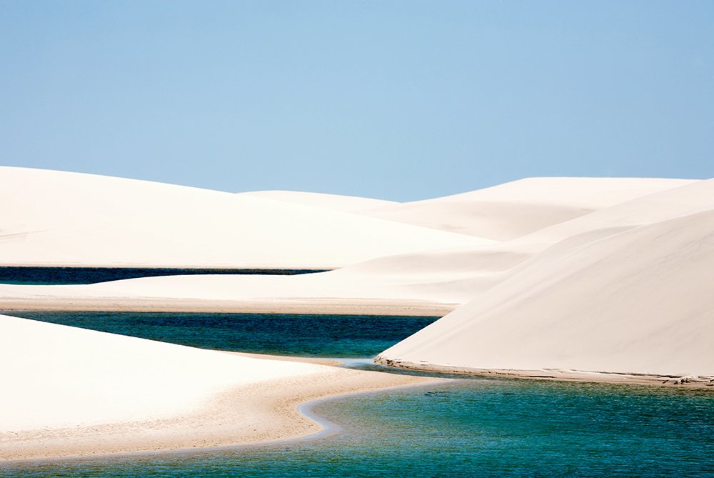 The Lençóis Maranhenses National Park consists of hundreds of large, white sweeping sand dunes. It looks like your typical desert, but with hundreds and hundreds of colourful lagoons sprinkled between them. Located just outside the Amazon Basin the region is subject to a regular rainy season. This regular rain fall causes amazingly beautiful lagoons of flat water to form in the valleys between the sand dunes. The lagoons come in stunning colours of blue, grey and even black.